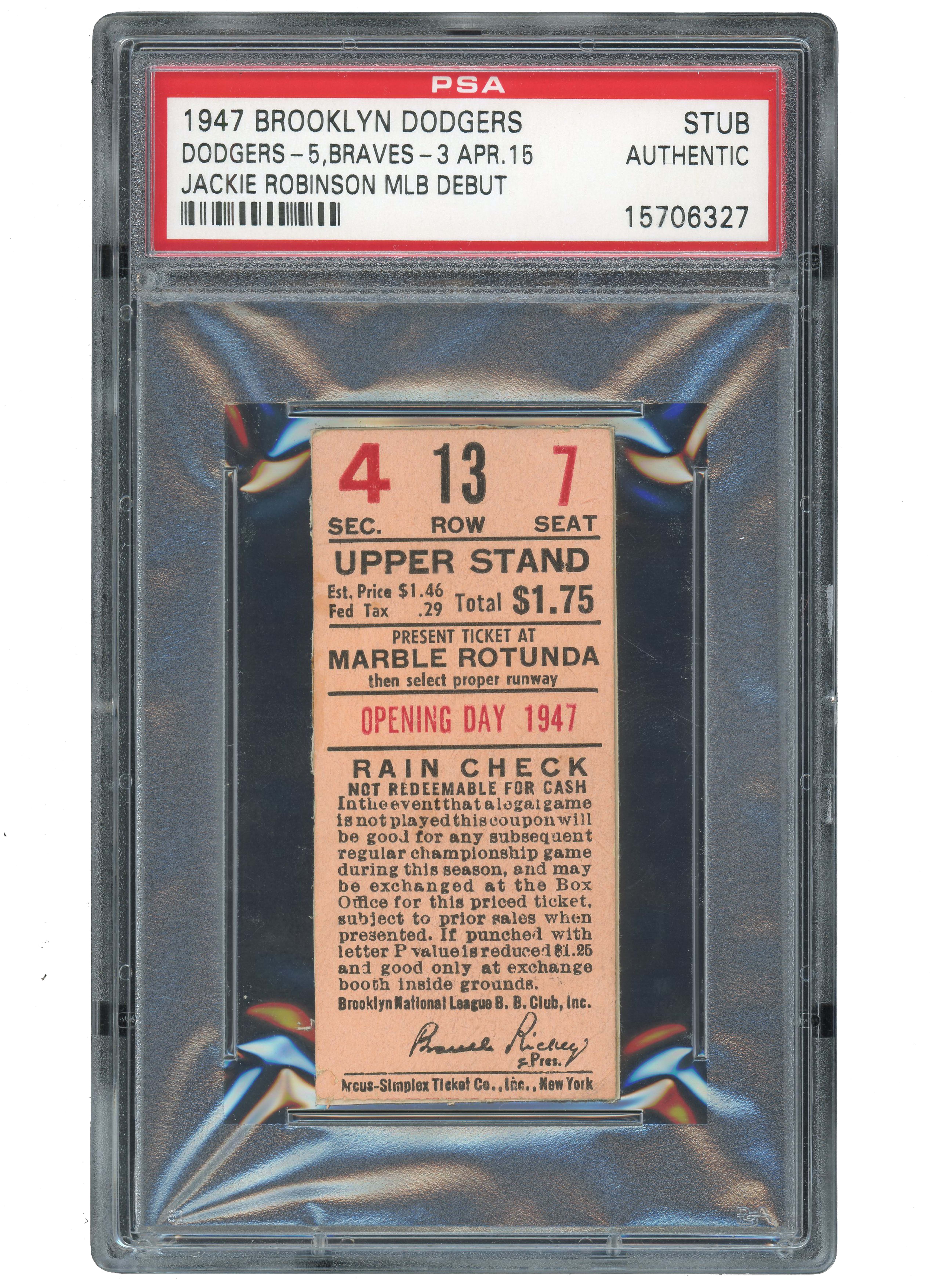 - Monumental April 15, 1947 Brooklyn Dodgers Opening Day Ticket Stub - JACKIE ROBINSON MLB DEBUT TO BREAK BASEBALL'S COLOR BARRIER! - PSA AUTHENTIC (POP 5, ONLY 3 RATED HIGHER) — $100,000+